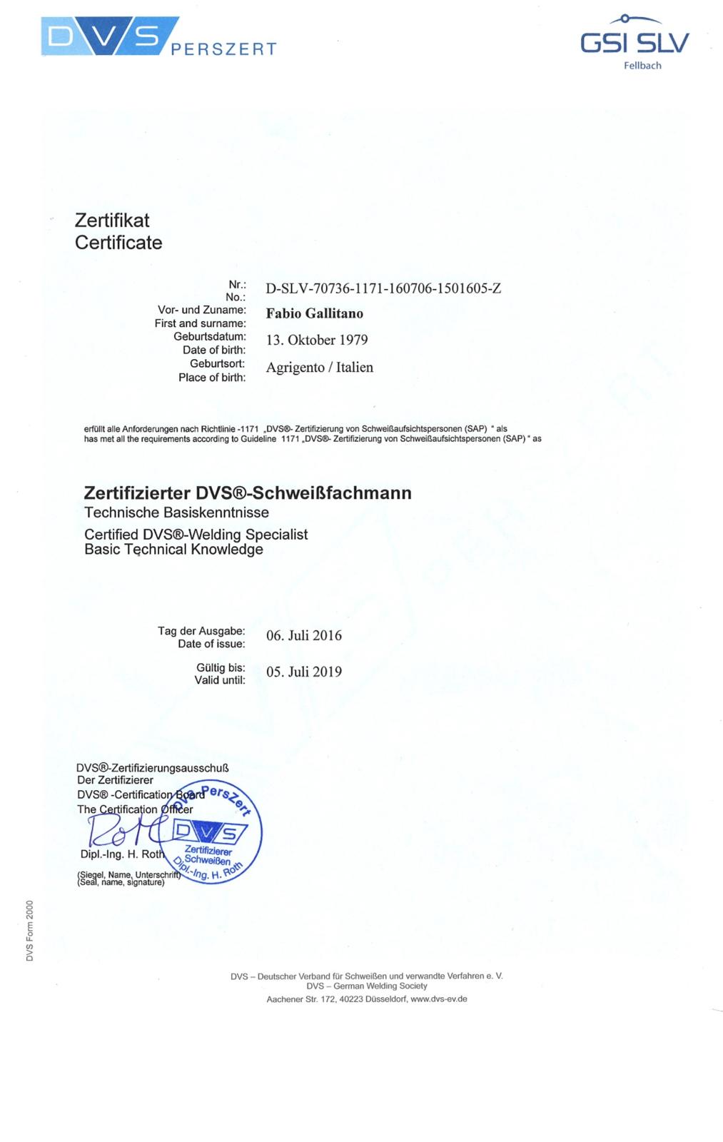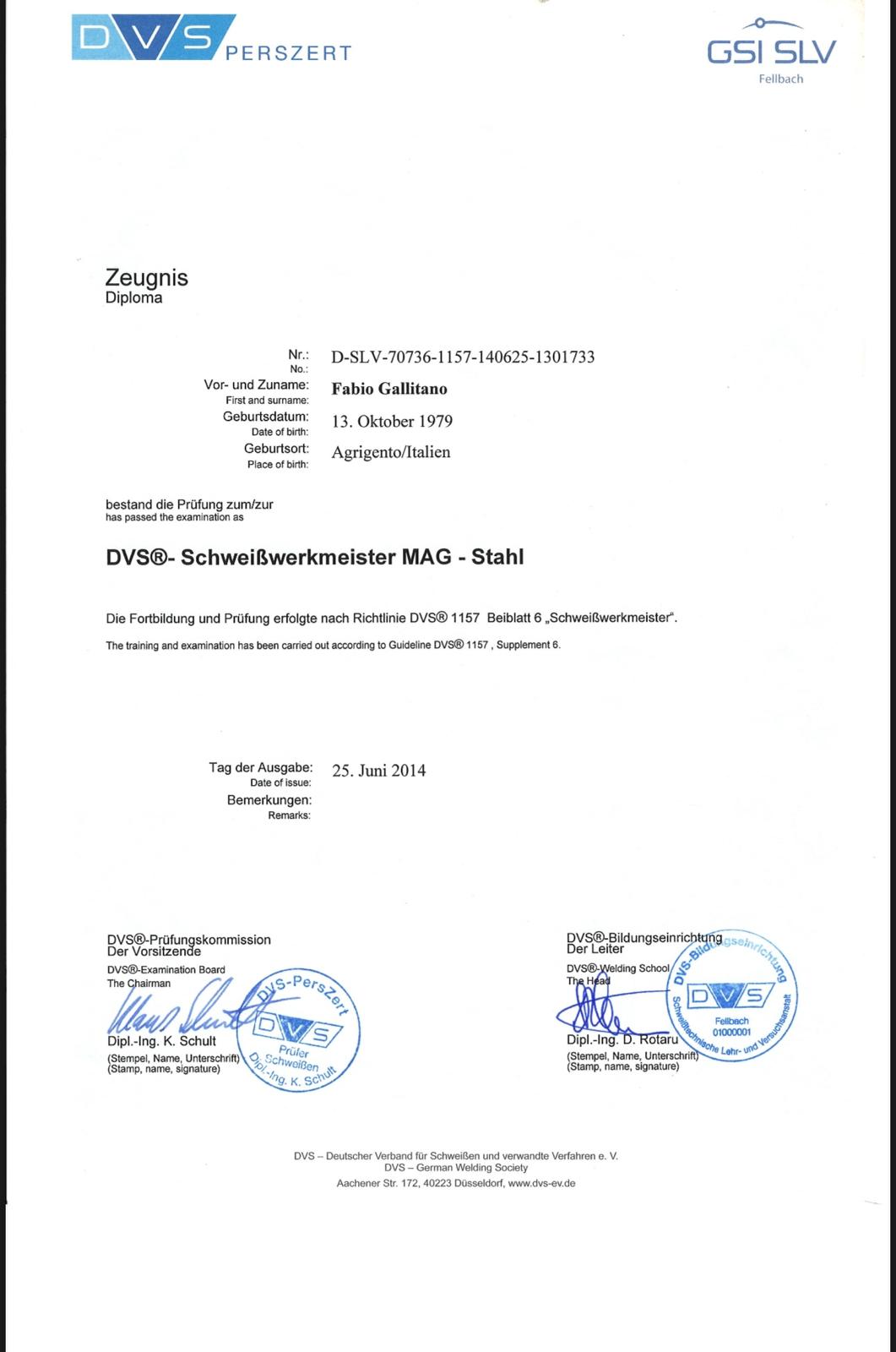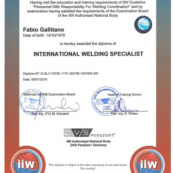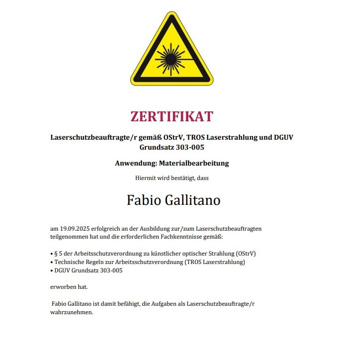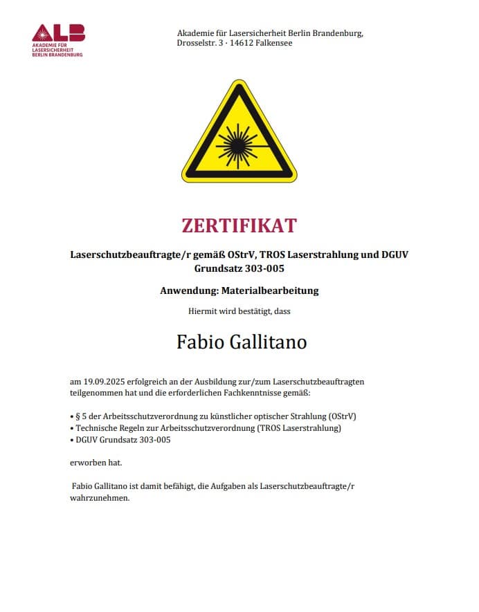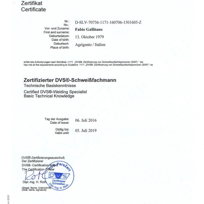 WELDPRO steht für geprüfte Qualität und fundiertes Fachwissen in der Schweiß- und Lasertechnik. Inhaber Fabio Gallitano ist zertifizierter DVS®-Schweißwerkmeister (MAG-Stahl), DVS®-IIW International Welding Specialist (IWS) sowie ausgebildeter Laserschutzbeauftragter nach OStrV / TROS Laserstrahlung.